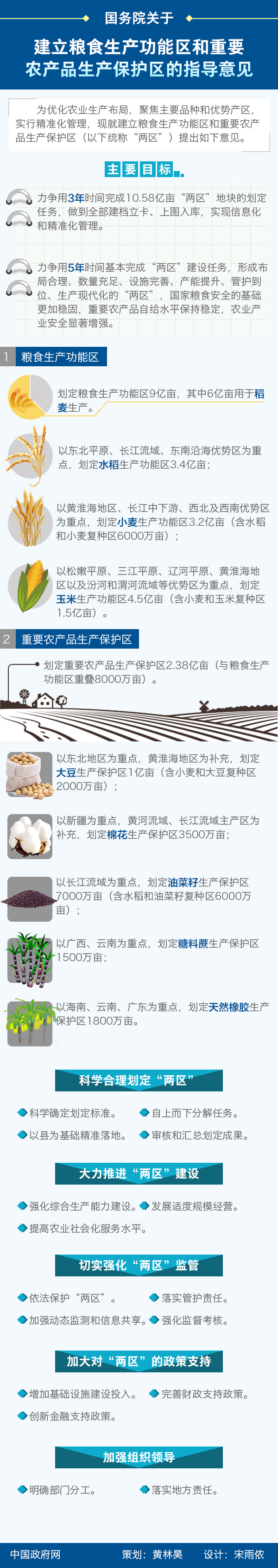 1.粮食生产功能区。划定粮食生产功能区9亿亩,其中6亿亩用于稻麦生产。以东北平原、长江流域、东南沿海优势区为重点,划定水稻生产功能区3.4亿亩;以黄淮海地区、长江中下游、西北及西南优势区为重点,划定小麦生产功能区3.2亿亩(含水稻和小麦复种区6000万亩);以松嫩平原、三江平原、辽河平原、黄淮海地区以及汾河和渭河流域等优势区为重点,划定玉米生产功能区4.5亿亩(含小麦和玉米复种区1.5亿亩)。