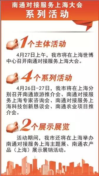 4月27日,南通市委、市政府在上海召开以“服务大上海,建设‘北大门’”为主题的对接服务大会,期间举办覆盖产业、科技、人才、主题展览等领域的“1+4+2”系列活动。