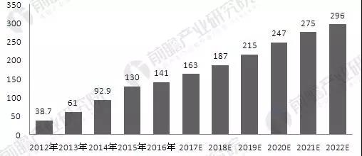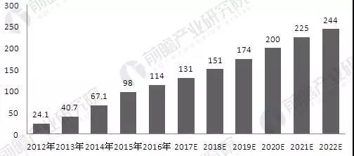2012-2022年全球大数据专业服务市场规模及预测(单位:亿美元)