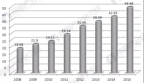 2008-2015年中国文化产业市场规模及增长率(单位:亿元,%)