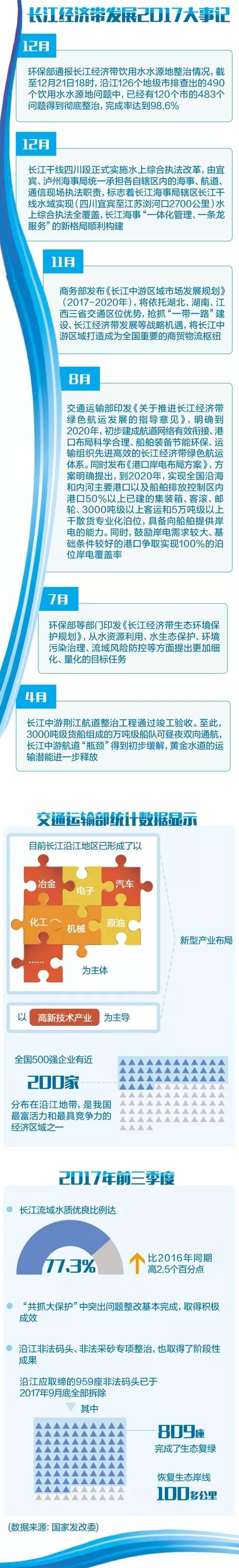 ——推进航道畅通,长江干线航道系统治理有序推进,南京以下12.5米深水航道建设二期工程进展顺利,黄金水道功能不断提升。2017年8月份,交通运输部印发《关于推进长江经济带绿色航运发展的指导意见》,明确到2020年,初步建成航道网络有效衔接、港口布局科学合理、船舶装备节能环保、运输组织先进高效的长江经济带绿色航运体系。