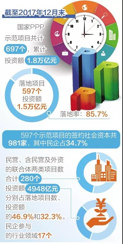 民营企业参与示范项目规模达三分之一。截至2017年12月末,国家示范项目共计697个,累计投资额1.8万亿元。其中,落地项目597个,投资额1.5万亿元,落地率85.7%,继续保持增长态势。597个示范项目的签约社会资本共981家,其中民企占34.7%。