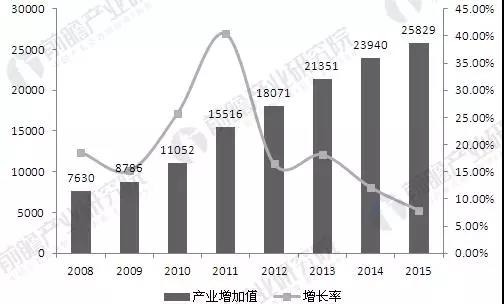 年中国国文化产业增加值为21351亿元,与GDP的比值为3.63%。2014年中国国文化产业增加值为23940亿元,与GDP的比值为3.76%,同比增长12.1%。2015年我国文化产业实现增加值25829亿元,比2013年增长21.0%(未扣除价格因素影响,下同);年平均增长10.0%,比同期GDP现价增速高2.3个百分点。
